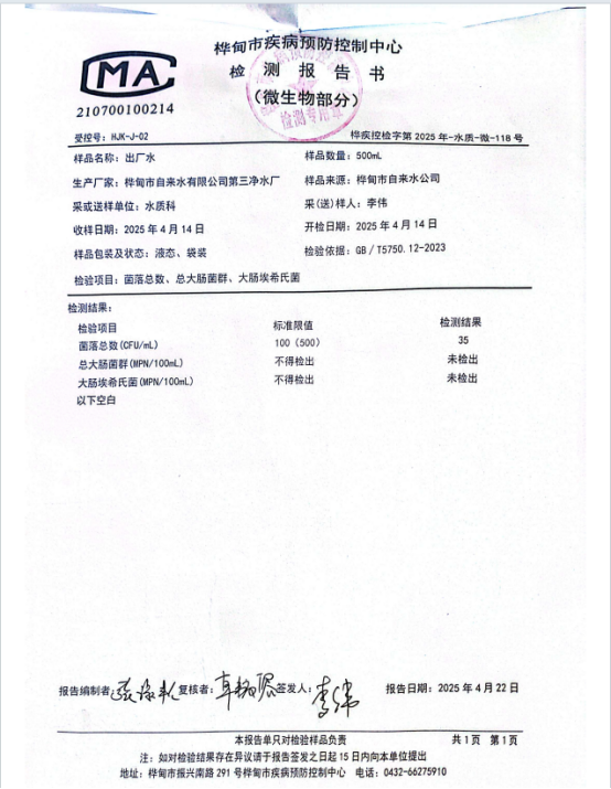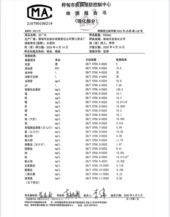 按照《水污染防治行动计划》要求,自2018年起,所有县级及以上城市,每季度都要将本行政区域内供水出厂水水质,饮水安全状况等信息向社会公开。现将2025年第二季度桦甸市三水厂出厂水水质检测结果公开如下: